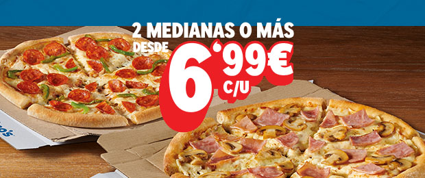 • Elige dos o más, llévate 2 o más pizzas a recoger desde 6,99€ cada una. Pizza mediana margarita (base de tomate + queso 100% Mozzarella) + 2 ingredientes por 6,99€ cada una. Masas Roll o masa Croissantizzima+1,99€. Promoción válida hasta el 09/02/2026.